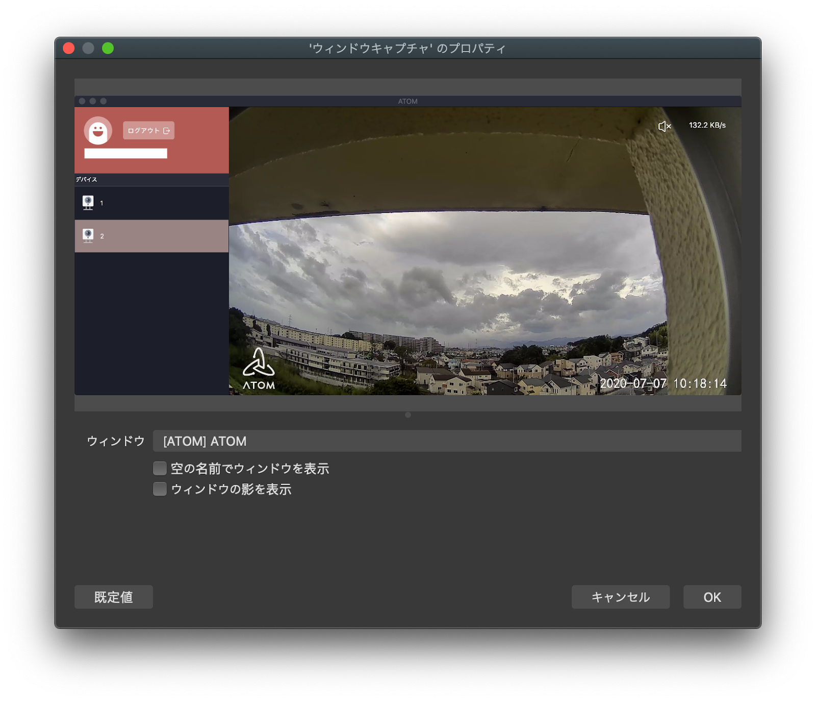そうすると「ソース」リストに「ウィンドウキャプチャ」を追加し、プロパティ画面も表示されます。「ウィンドウ」メニューに「[ATOM] ATOM」を選択してください。